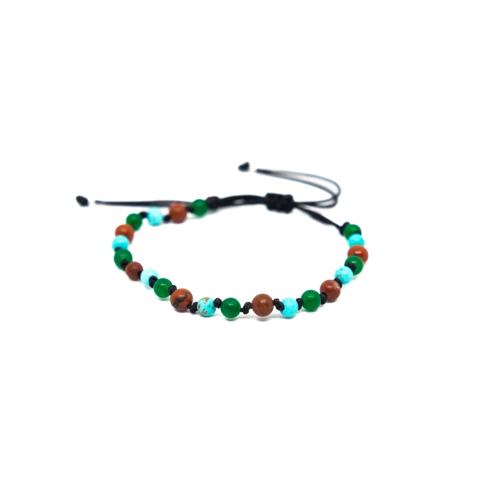 Material : turquoise, red jasper and green agate natural stones, cotton cord, silver plated bronze metal