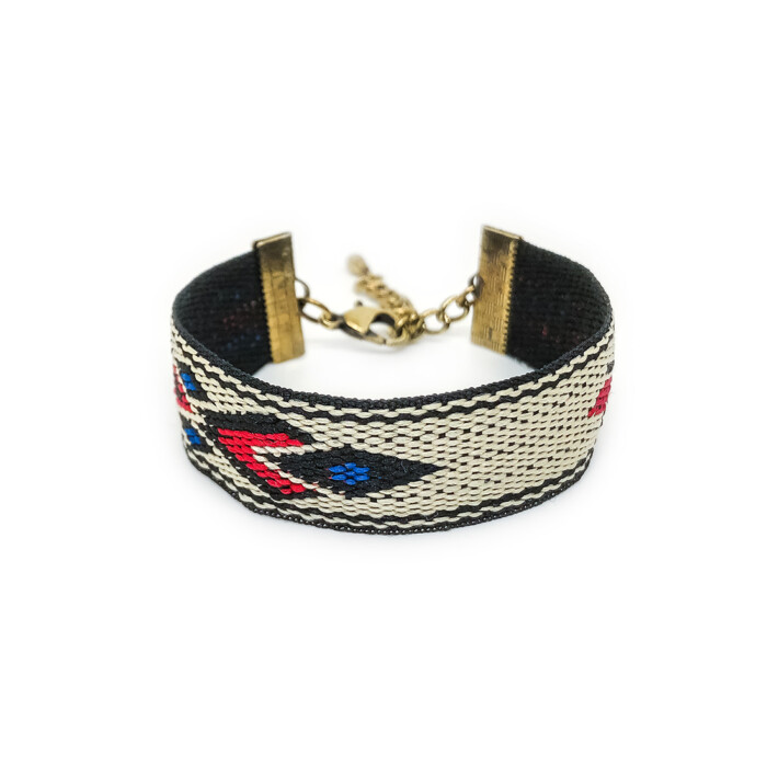 Pisidiki is a beautiful bracelet, handmade with a multicolored fabric and a bronze metal clip. This bracelet is adjustable and can be worn all day long. It can be mixed and matched with PERSEFONI.