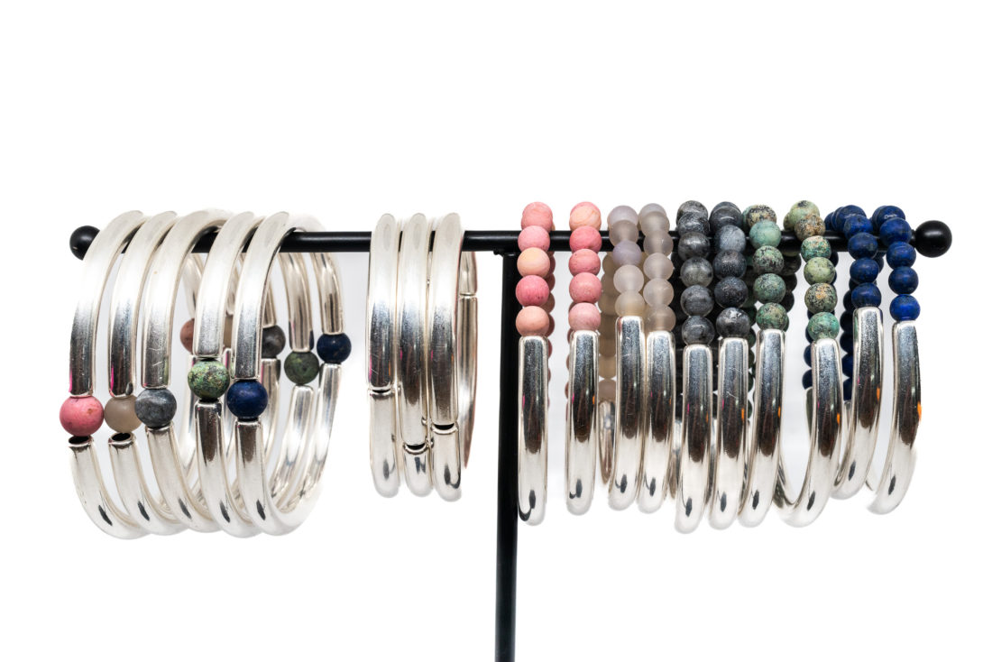 Material : natural stones, silver plated bronze metal, elastic silicone